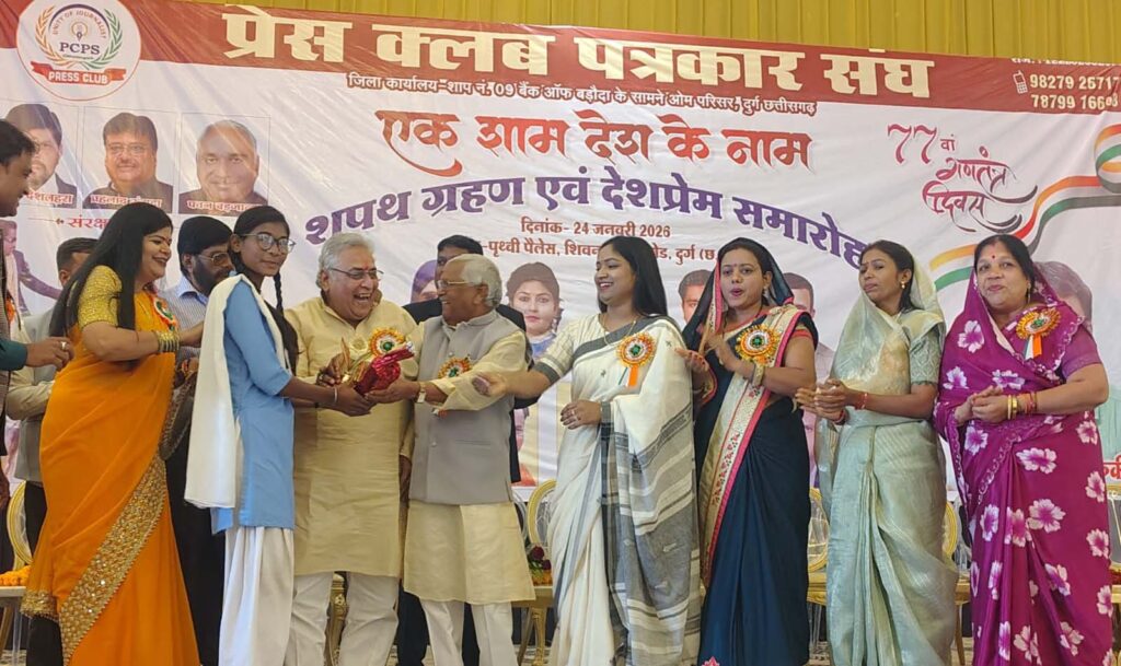 दुर्ग। प्रेस क्लब पत्रकार संघ जिला दुर्ग द्वारा ‘पृथ्वी पैलेस’ में आयोजित भव्य समारोह ने पत्रकारिता और सामाजिक एकजुटता की एक नई मिसाल पेश की। इस कार्यक्रम में न केवल नई कार्यकारिणी का शपथ ग्रहण हुआ, बल्कि दिव्यांग बच्चों के सम्मान और पूर्व सैनिकों के अभिनंदन ने इसे मानवीय संवेदनाओं से सराबोर कर दिया।
